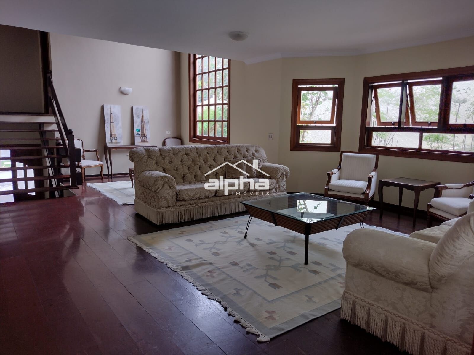 4 suítes, sala íntima com lareira, sala de estar e jantar, cozinha com sala de almoço.