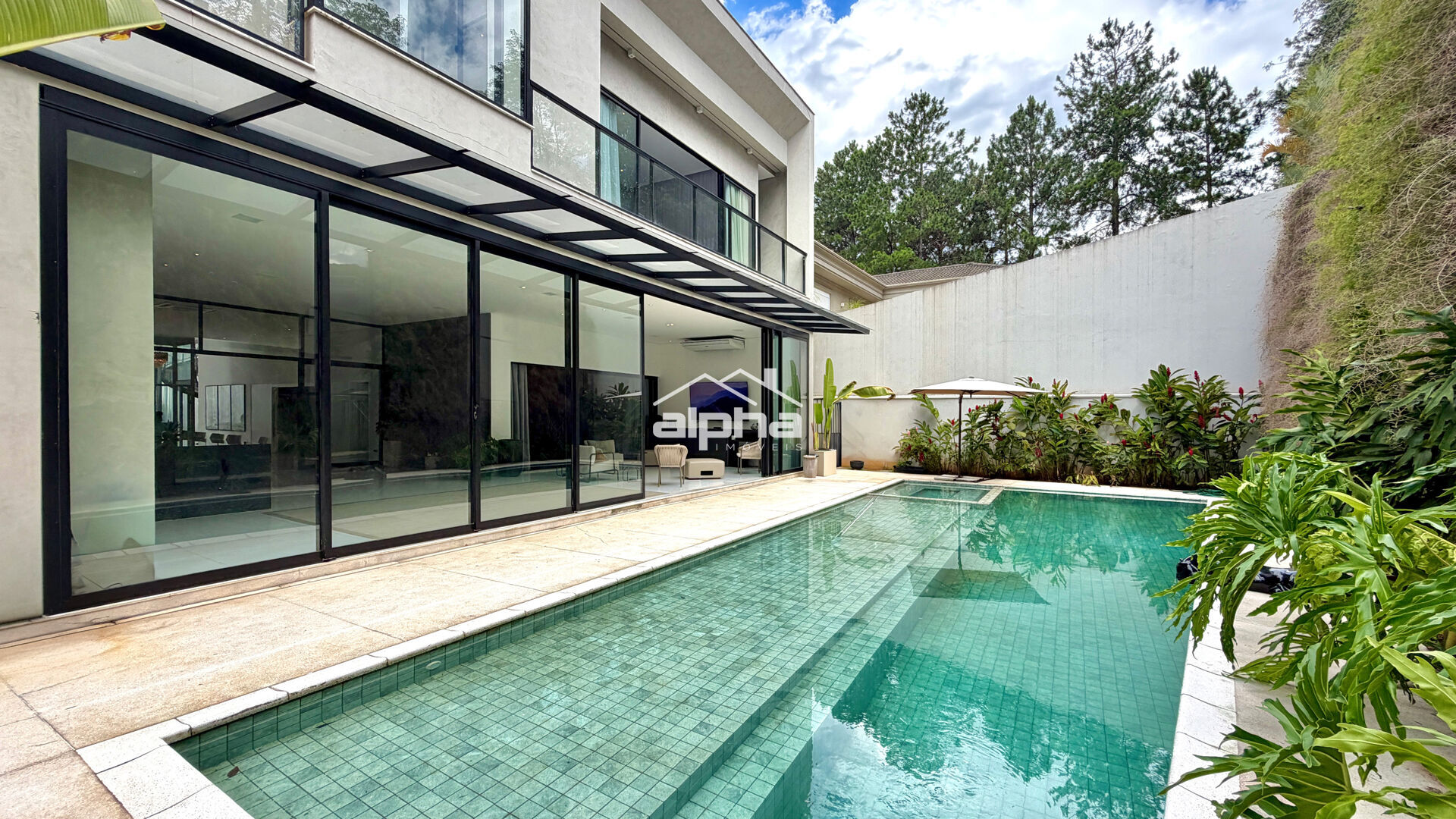 Os espaços sociais incluem um home theater privativo, escritório, adega e espaço gourmet que conversa diretamente com a área externa, onde piscina e jardim proporcionam um ambiente ideal para lazer e convivência. Os acabamentos de alto padrão, como armários planejados, lareira, persianas automatizadas e iluminação natural generosa, refletem atenção aos detalhes e conforto em cada ambiente.